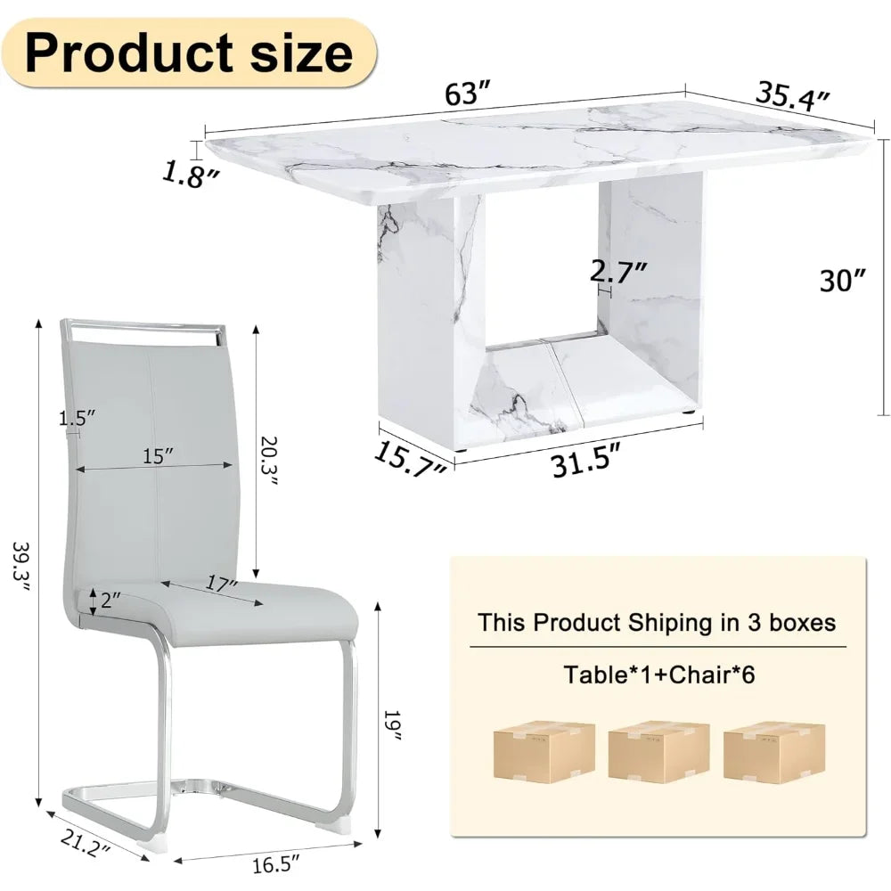 Dine in style with this 6-piece dining table set. Featuring a 63" white imitation marble table and six PU leather chairs, it combines modern elegance with comfort—perfect for family meals or entertaining guests.