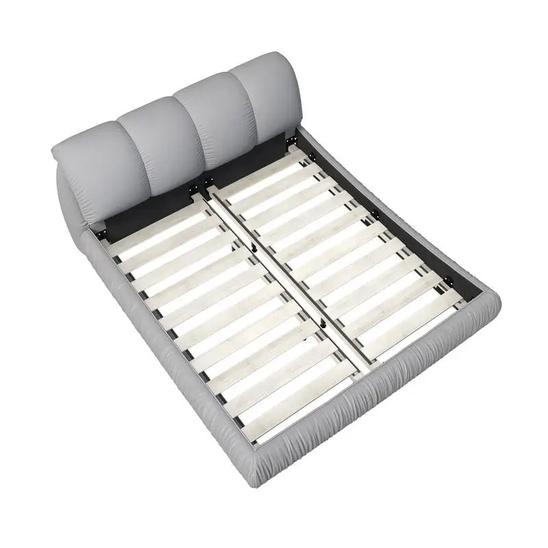 King-size upholstered platform bed with an oversized padded backrest and solid wood frame. Designed for durability, comfort, and compatibility with various mattress heights.